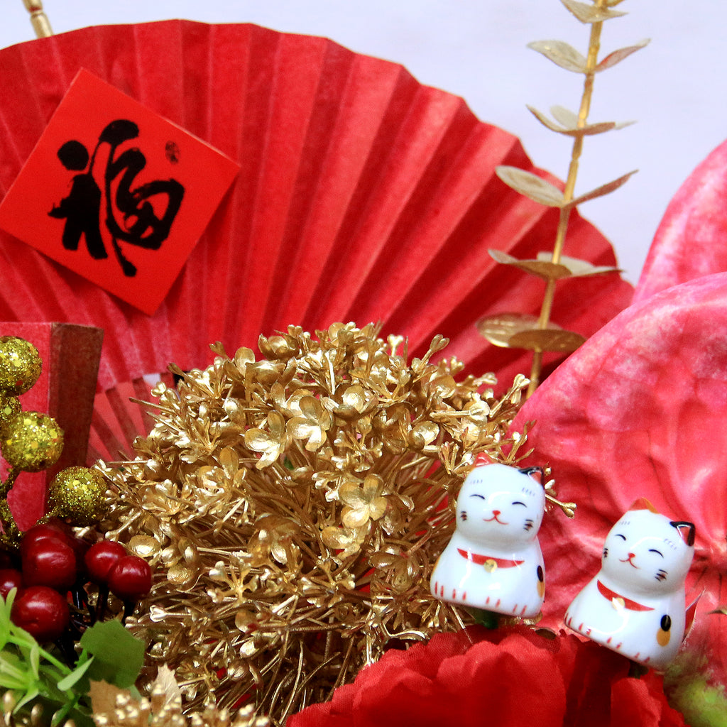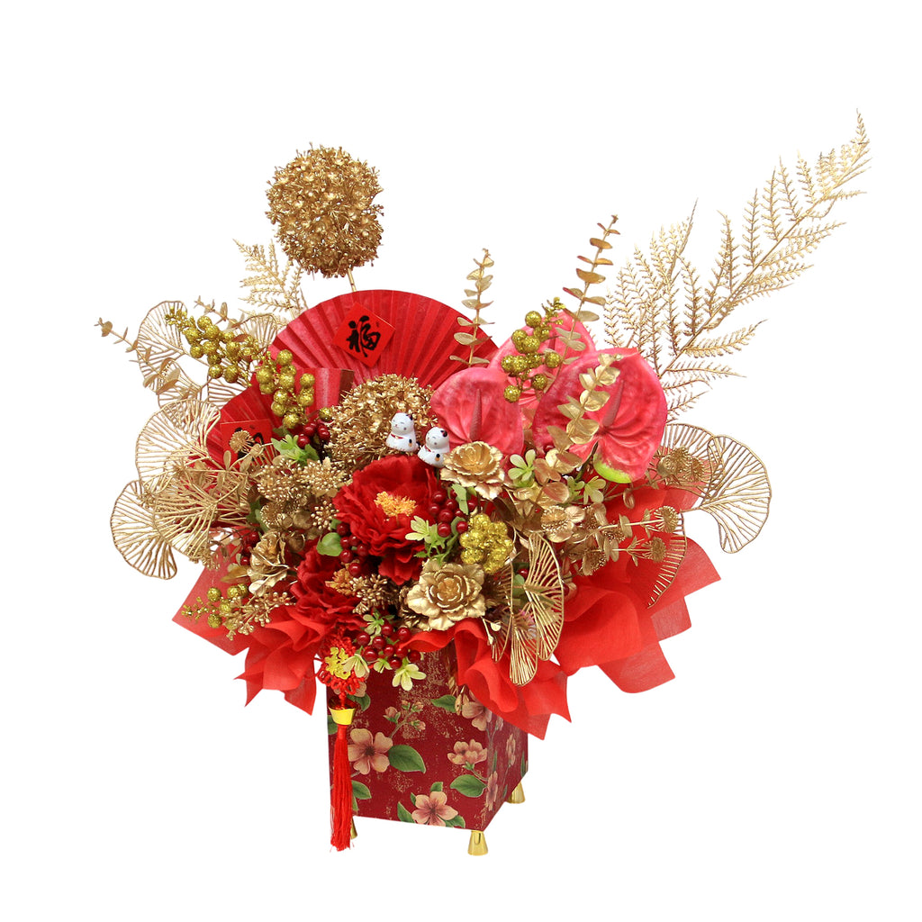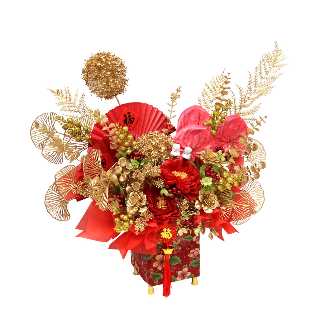 Celebrate the upcoming Chinese New Year with this beautiful, long-lasting flower arrangement featuring a vibrant traditional red & gold color. It measures approximately 65cm by 70cm, making it a wonderful addition to your festivities.