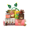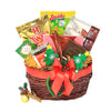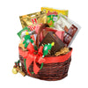 This holiday hamper features an assortment of premium snacks, cookies, and chocolates, elegantly presented in a charming willow basket for a refined gift experience.