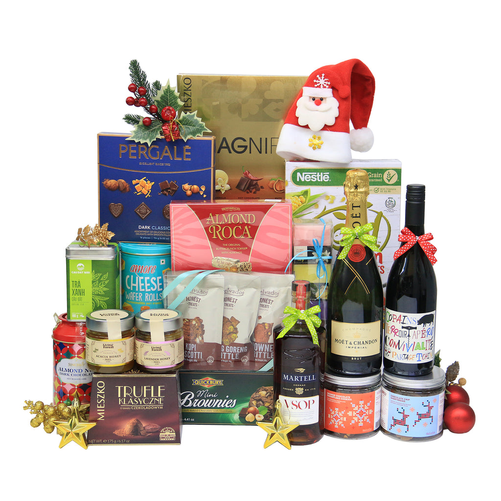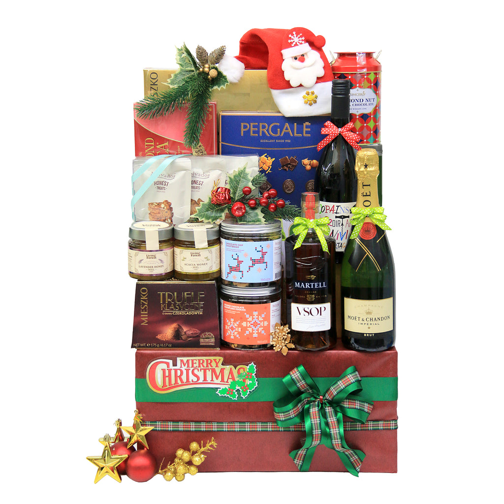 This luxury Christmas hamper features distinguished Champagne, Martell brandy, wine, cookies,chocolates and an assortment of gourmet treats. It is an excellent gift choice for business associates.